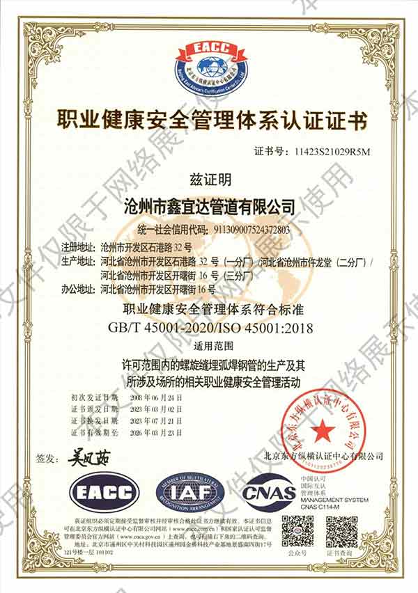滄州市鑫宜達管道有限公司成立于2003年7月,坐落于滄州經濟開發(fā)區,占地面積40萬平方米,注冊資金1.81億元,是集螺旋鋼管生產、防腐加工以及無縫鋼管、卷板、帶鋼等品類鋼材經營銷售于一體的工貿型企業。公司現有員工400多人,其中,中高級技術職稱的人員達120余名。 滄州市鑫宜達管道有限公司擁有9條螺旋鋼管生產線和3PE防腐生產線,可生產直徑219--3640mm,壁厚5.5--28mm,最高鋼級X100的各種規(guī)格防腐螺旋鋼管...